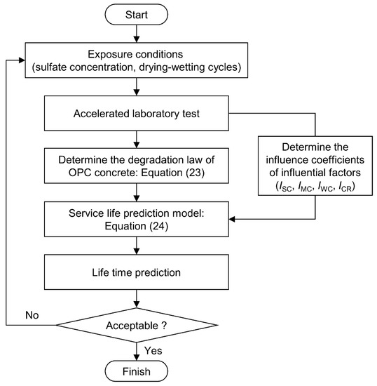 Figure 8. Flowchart for service life prediction of concrete subjected to DW cycles with SA.