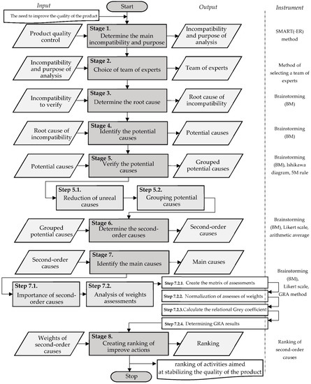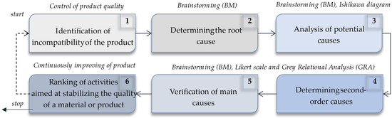 It was concluded that quality management tools were used to verify the incompatibilities of industrial products, e.g., [12,18,21]. Their applications include verifying the potential causes of incompatibilities and determining the main causes [22,23]. Despite that, these analyses were not a destination of sequential reducing causes of incompatibility by its importance, i.e., determining the impact (importance) of these causes on occurring incompatibility. Therefore, these studies include a gap in the lack of methods that are applied to create a ranking of causes of incompatibility, where this ranking would allow for ranking actions that support the stabilization of product quality. Therefore, the objective of the article was to develop a new model that supports the stabilization quality of industrial products. During the development of this model, the hypothesis was assumed: