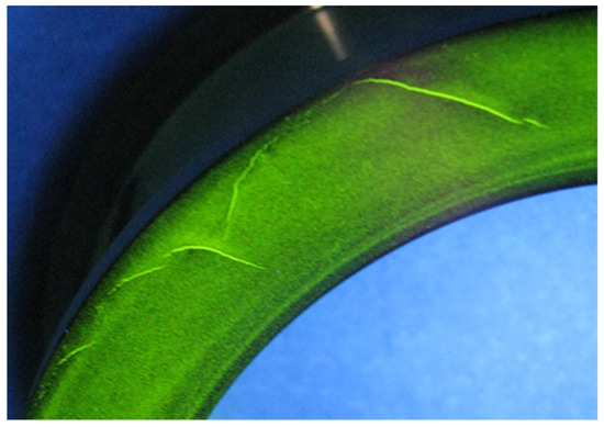 The main incompatibility was a crack in the outer hull of 418 alloy four-point bearing (CPW-S 5616). This incompatibility was identified by non-destructive tests (magnetic powder method), as shown in this study [2]. The crack was a flat incompatibility, where stresses occur at the ends of it. As a result, a notch will form, causing the crack to develop further [42]. The example of the crack in the outer hull is shown in Figure 3.