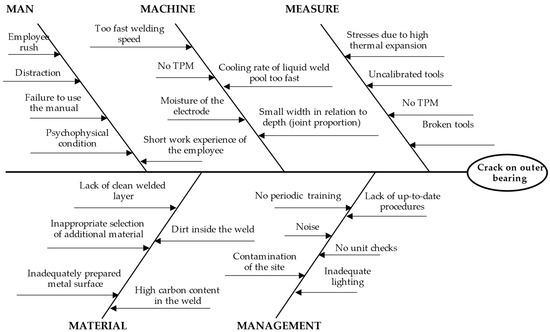 At this stage, verification of all potential causes is done. The purpose of this stage is to determine the potential causes, which could have an impact on the occurred incompatibility, and then show these causes in a standardized way. The result of this stage is the Ishikawa diagram for potential (initial) causes, which are grouped according to the 5M rule [18,19,21]. At this stage, all potential causes have the same weights, i.e., impact into incompatibility.