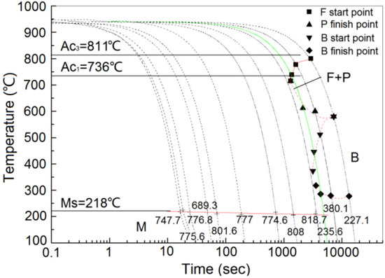 The microstructure and mechanical properties of medium/high carbon alloy steels are significantly influenced by their quenching and tempering temperatures, and phase transition kinetics control the resulting metallographic structure. The ZG70Cr2MnNiSi steel in this study is a hypoeutectoid steel (C < 0.77%), and hypoeutectoid steel has a bainite transition zone. The critical temperatures of the ZG70Cr2MnNiSi steel were measured as Ac1 = 736 °C, Ac3 = 811 °C, and Ms = 218 °C. The CCT curve of the ZG70Cr2MnNiSi steel is shown in Figure 2. Transformations ranged from austenite to ferrite and pearlite (A → F and P), austenite to bainite (A → B), and austenite to martensite (A → M) depending on the cooling rate. The pearlite and bainite transformation zones of the tested steels are shown on the right in Figure 2.