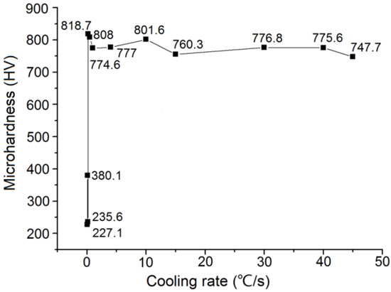 The microhardness curves of the tested steels changed with the cooling rate, as shown in Figure 3. The microhardness gradually increased with increasing cooling rate. The microhardness increased sharply when the cooling rate increased from 0.05 °C/s to 0.15 °C/s. When the cooling rate increased from 15 °C/s to 45 °C/s, the microhardness did not change significantly. Under these conditions, the structure of the steel consisted of a mixture of martensite and a very small amount of residual austenite, and the hardness of martensite tended to be stable.