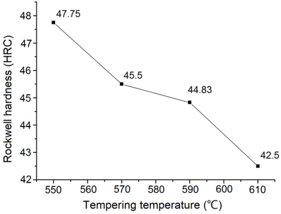 The relationship between the tempering temperature and hardness of the ZG70Cr2MnNiSi steel is shown in Figure 5. With increasing the tempering temperature, the steel hardness decreased due to the decomposition of martensite and residual austenite and the transformation of carbides. In the range of 570 °C~590 °C, the hardness decreasing trend becomes weak and secondary hardening occurs. After tempering at 590 °C, the hardness of the tested steel reached approximately 45 HRC, which meets the wear resistance requirements for lining plates.