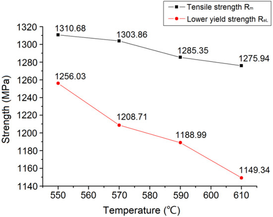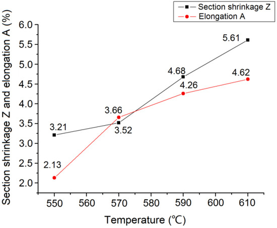 In Figure 6, the tensile strength of the experimental steel decreased gradually with increasing tempering temperature; however, the amplitude was small. The yield strength declined more sharply. Figure 7 shows that both the area and elongation decreased significantly with the increasing tempering temperature.