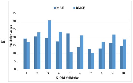 During execution, the validity of models was assessed using the k-fold cross-validation approach. The model’s performance was evaluated by applying statistical checks [55,56,57,58]. Generally, in the k-fold cross-validation method, data are split into ten groups for random dispersion with ten times the repetition of this method to achieve satisfactory outcomes. Statistical checks for all the models are listed in Table 2 and Figure 11a–c. The R2 values for SFRHSC compressive strength are 0.71, 0.94, and 0.86 in the case of standalone MLPNN, Bagging, and AdaBoost models, respectively, as illustrated in Figure 5, Figure 7 and Figure 9. Table 2 shows the values of MAE and RMSE for SFRHSC compressive strength. The MAE are 12.77, 8.12, and 11.16 in the case of standalone MLPNN, Bagging, and AdaBoost models, respectively. The RMSE are 16.37, 11.06, and 14.22 for MLPNN, Bagging, and AdaBoost models, respectively. It may be noted that the R2 value in the case of Bagging is higher compared to other considered models having lesser error values for compressive strength of SFRHSC. A comparison of current model with previous models is shown in Table 3.