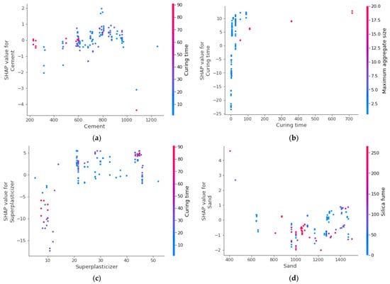 The SHAP interaction plot for all the considered input parameters is shown in Figure 14. The cement content is directly related to SFRHSC compressive strength, and its interaction increases with the curing time. As can be observed from Figure 14a, up to 1000 kg/m3 is used as required for HSC. The curing time shows positive linear relation with SFRHSC compressive strength (Figure 14b). Similarly, as presented in Figure 14c, the super-plasticizer also positively influences SFRHSC compressive strength up to optimum content. As depicted in Figure 14d, up to almost 1000 kg/m3 content of sand, is showing appropriate influence; however, further addition in its content causes reduction in SFRHSC compressive strength. Water shows both influences (Figure 14e) and its content is kept lesser, as in the case of HSC, and a controlled water content is used with more super-plasticizer content to achieve high strength. As far as the interaction of steel fiber content is concerned (Figure 14f), content up to 2.5% depicts a positive influence; however, beyond this content, its influence becomes negative on SFRHSC compressive strength. Figure 14g shows that nano silica positively influences the SFRHSC compressive strength up to optimum content, i.e., 30 kg/m3. The higher content, i.e., 40 kg/m3, of nano silica ultimately results in reduced strength due to its larger surface area. Although the aggregate size is a positive influence, the much larger aggregate size may come up with negative results, as shown in Figure 14h. Commonly, a small-size aggregate is used for HSC. The addition of multiple supplementary cementitious materials demands a smaller size of aggregate to achieve higher strength. As in this scenario, the strength of the cementitious matrix is much higher than aggregate strength; therefore, relatively smaller aggregates are preferable for HSC. In the same manner, the fly ash content (Figure 14i) and steel fiber length (Figure 14j) also positively influence it up to an optimum content. As in the case of enhanced steel fiber length, the number of fibers decreases. In the case of compressive strength, the shorter length of fibers is preferable.