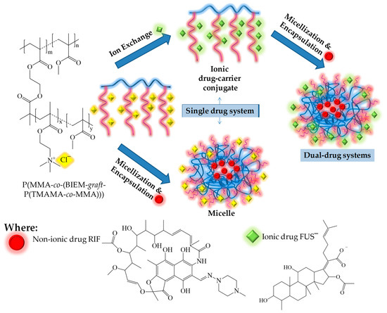 Graft copolymers with various contents of IL units were tested for obtaining three types of carriers, i.e., single-drug systems with conjugated FUS or encapsulated RIF, as well as dual-drug systems with conjugated FUS and encapsulated RIF. The drug delivery properties of these systems were verified. The ionic structure of the tested copolymers allowed for an ion exchange reaction of chloride anions to FUS−, which resulted in ionic drug-carrier conjugates. Both chloride-based copolymers and FUS conjugates showed the ability to self-organize; thus, they could be applied for the encapsulation of the non-ionic drug RIF in polymer micelle superstructures. The entrapment of RIF in the self-assembled conjugates with FUS− was advantageous for achieving dual-drug systems for co-delivery applications. Drugs were successfully introduced into both conjugates and/or micellar carriers (FUS ≤ 54% and RIF ≤ 67%). There was no significant effect of the anion type (chloride vs. pharmaceutical fusidate) on the RIF encapsulation efficiency. The sizes of the self-assembled particles for the main fraction decreased in the following order: FUS conjugates (26–208 nm, 58–100%), RIF micelles (40–97 nm, 55–96%), and micellar conjugates FUS/RIF (31–65 nm, 52–95%). During in vitro studies in PBS, an initial burst release was observed. The amounts of the drugs released varied in a wide range, between 19–81%, depended on the side chain length and ionic content of the polymer, as well as the drug and carrier type. In conclusion, the selected trimethylammonium-containing graft copolymers are sufficient for obtaining single-drug systems in the form of micelles or ionic conjugates. They are also suitable as innovative dual-drug systems carrying two drugs, connected by a polymer matrix, in different ways (physically vs. ionically). The selected drugs (RIF and FUS) can be used for antibacterial treatment, including drug-resistant bacterial strains and combined therapy, with simultaneous drug co-delivery.