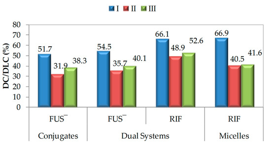 The degree of non-ionic drug encapsulation, namely the drug loading content (DLC), was calculated as a percentage of the drug loading concentration to the total concentration of the copolymer/conjugate and the loaded drug, using UV-Vis spectroscopy. Similar to FUS exchange, the encapsulation of RIF was the most efficient in copolymer I (Figure 2). It was also observed that the presence of an anionic drug in the polymer did not greatly impact its encapsulation (in micelles of a single-drug system, DLCRIF = 66.9% vs. the dual-drug system, DLCRIF = 66.1%). A similar trend was observed when II or III was used as the matrix, but they could encapsulate RIF in lower amounts, i.e., 50% and 40%, respectively.