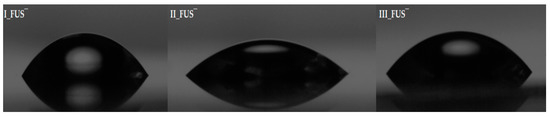 Goniometry is a convenient method for measuring the water contact angle (CA, Table 2) using the sessile drop technique. The evaluation of a polymer film’s wettability indirectly describes the hydrophilic-hydrophobic balance in the macromolecule. It also helps show the specific influence of the polymer structure, including the type of counterion (Cl− vs. FUS−). Polymer I, with the highest amount of hydrophilic TMAMA units in the grafts and the lowest molecular weight (I:FTMAMA = 43%; Mn = 273.1 × 103 g/mol), was characterized by the highest CA (56.3° and 51.0°, for carriers bearing Cl and FUS anions, respectively). The CA values slightly decreased after counterion exchange to FUS− due to the higher hydrophilicity of the FUS− systems. The differences in the water contact angles for the FUS conjugates are shown in Figure 3.