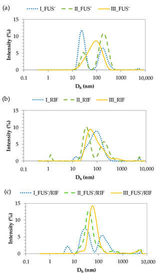 The hydrodynamic diameters (Dh) of the obtained carriers were determined by DLS in an aqueous solution. Figure 4 shows the histograms of polymer particles, and the detailed data are presented in Table S1. Compared with previously studied chloride-based copolymers [39], the introduction of FUS anions increased the particle sizes, except for system III (Cl−: 105 nm vs. FUS−: 95 nm). FUS− conjugates I and II formed two fractions of particles at 30 nm and 200 nm. However, in the latter system, the larger particles were the dominant fraction. Similar differences were observed for both types of systems after the micellization of RIF, but the particle sizes of the dominant fraction were evaluated to be 30–40 nm (52–55%) and 51–97 nm (90–94%). The highest molecular weight of copolymer III helped generate monomodal particles, which depended on the system and reached sizes of 95 nm (FUS− conjugate), 94 nm (RIF micelles), and 65 nm (micellar conjugate FUS−/RIF).