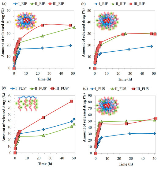 Kinetic release profiles of RIF from various types of carriers: (a) micelles and (b) dual-drug systems or FUS from (c) conjugates and (d) dual-drug systems, based on PIL graft copolymers I–III.