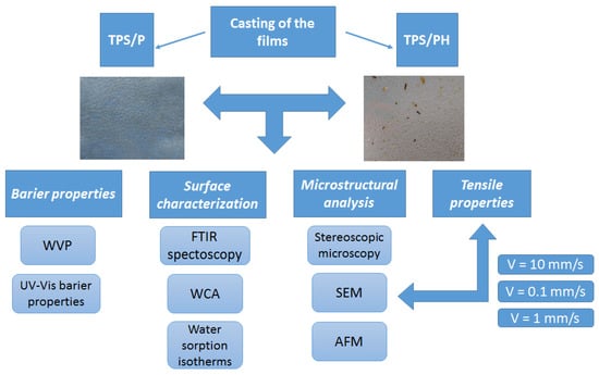 The procedure of casting thermoplastic starch films without psyllium husk (pure TPS/P) and with the addition of psyllium husk (TPS/PH) was the same and based on [29], with some modifications. Distilled water was used to prepare film-forming solutions. Potato starch and psyllium husk were added to distilled water at a concentration of 4.3% (w/w) for potato starch and 1% (w/w) for psyllium husk, respectively. The solution was heated to 80 °C under constant stirring (300 rpm) using a magnetic stirrer (Steinberg SBS-MR-1600/1T (Steinberg Systems, Zielona Góra, Poland) for 30 min. Subsequently, the solution was cooled to 40 °C and glycerol was added in the amount of 1.3% (w/w). The entire solution was mixed using an ultrasonic homogenizer TF-650N (Tefic Biotech CO., Beijing, China) for 50 min. The mixtures were poured into 200 mm × 200 mm acrylic glass molds and dried in a KBC-65 thermal research chamber (WAMED, Warszawa, Poland) at 35 °C for 20 h. After removal from the molds, the films were conditioned at the temperature of 22 °C and 40% relative humidity (RH) for 24 h. A detailed description of the experimental procedures can be tracked in Figure 1. The thickness of each film was measured with a digital micrometer with an accuracy of ±1 µm just after it was peeled from the acrylic glass mold. Thickness measurements of five locations were taken for each film (one in the center of the film and four around the perimeter) in at least ten replications. For calculations, the mean value was used (Table 1).