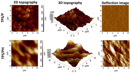 Figure 3 shows the 2D and 3D topography of the samples and the corresponding deflection images. TPS/P films were characterized by a flat surface with an average roughness (Ra) of 22.15 nm and with an average maximum peak height (Rp) of 82.91 nm (Table 1). A similar value of Ra was obtained in [41] for films made from corn starch. The addition of PH caused an increase in calculated roughness parameters. The TPS/PH film surface was more irregular, with high peaks and deep valleys. Ra and Rq increased more than five times compared to the pure thermoplastic starch film (Table 1). The complex structure of TPS/PH film observed in 3D topographic AFM images can be associated with the highly branched structure of the polysaccharide extract from psyllium husk seeds [1]. According to the one-way ANOVA test, the observed differences in roughness parameters were statistically significant (at the level of significance of α = 0.05). The results of imaging with AFM indicate the usefulness of this method for imaging the impact of additives on the important parameters of the surface of TPS [42].