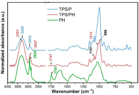 Average FTIR spectra of psyllium husk (PH), native TPS/P, and chemically modified starch composite TPS/PH films. The band positions in black indicate the same values for TPS/P and TPS/PH samples.