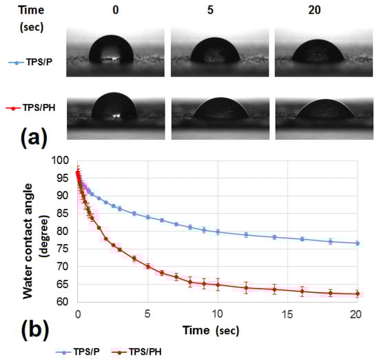 Shape (a) and behavior (b) of water drops on pure thermoplastic starch film (TPS/P) and thermoplastic starch film with psyllium husk addition (TPS/PH) as a function of time (0–20 s).