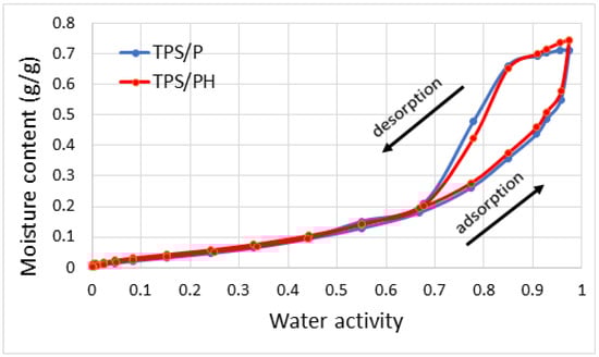 Figure 6 presents water vapor sorption isotherms of TPS/P and TPS/PH films. The S-shape of the isotherms indicates that they are type II of the Brunauer–Emmett–Teller classification [60]. This curve shape is observed for many carbohydrate polymer-based films [62,63,64]. Sorption isotherms were characterized by the presence of a slight inflection at low water vapor pressures (aw ≈ 0.1), a more or less inclined middle part, aw from ≈0.1 to 0.7, and a rapid increase in the amount of adsorbed water vapor with aw ≈ 0.7. Adsorption and desorption processes were not fully reversible, revealing hysteresis at 0.68 aw values. The observed hysteresis loops belong to the H2 type according to the IUPAC classification, without a clear saturation effect at high aw values [65]. The presence of hysteresis was explained by Caurie [66], who stated that the desorption isotherm occurs at higher energy levels compared to the adsorption isotherm and that the energy difference may result from changes in the adsorbent structure and the formation of pores, microcracks, and fissures. Hysteresis may also reflect conformational rearrangements, which alter the accessibility of energetically favorable polar sites and influence sorption processes and water movement.