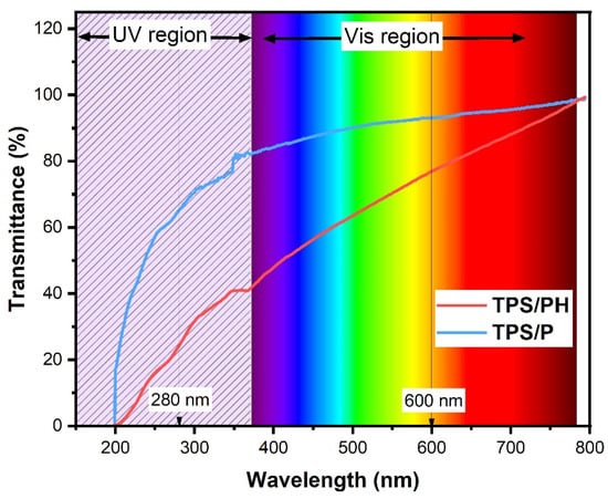 The UV-Vis transmittance patterns recorded for TPS/P and TPS/PH film samples are presented in Figure 7, and the values of transmittance and opacity at 280 and 600 nm are collected in Table 3. Adding PH led to a significant decrease in the transmittance of UV (Tr280) and visible light (Tr600), while opacity was increased [70]. The opacity of composite film at 600 nm increased with the addition of PH and was 43% higher than in the pure native starch film. Previous studies reported on the increasing opacity of biocomposites with increasing fiber content. The TPS/PH film sample exhibited low light transmission in UV light, especially at 280 nm. Films with PH show lower percent transmittance compared with the non-modified film, suggesting that TPS/PH films could have good barrier properties to UV light, a potent lipid-oxidizing agent in food systems.