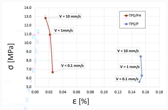 According to [71], tensile strength and elongation are two very important properties in packaging materials because they reflect the durability of films and their ability to enhance the mechanical integrity of food. Figure 8 shows the relationship between failure stress and failure strain at different deformation velocities (V = 0.1, V = 1, V = 10 mm/s). For the TPS/P film, as the deformation velocity increases, the failure point moves towards a higher stress, with strain values changing inconsiderably (statistically significant differences between the mean values of failure strain for the tested deformation velocities were not found). The addition of psyllium husk (TPS/PH films) resulted in an increase of the failure stress with a simultaneous decrease in the failure strain at the same deformation velocities (Figure 8). The mean values of failure strain for the tested deformation velocities were 86% lower for the psyllium husk-containing film than for the pure film, in contrast to the failure stress where the addition of PH increased by an average of 48% compared to the pure film in the range of the tested deformation velocities. The very small change of the failure strain in the tested range of deformation velocities may indicate that the damage of the film was caused by exceeding a specified strain value. This may prove the validity of the maximum strain criterion for the thermoplastic biodegradable film for deformation velocities in the range of 0.1–10 mm/s. Ahmadi et al. [19], who carried out tests on films made on the basis of psyllium husk (without TPS) with a similar glycerol content, at V = 50 mm/min, obtained a tensile strength of about 10 MPa and an elongation of 30%. In the same study, a decrease in tensile strength was observed with the higher content of this plasticizer. Glycerol, a small-molecular-sized plasticizer, easily diffuses into starch polymer chains to disrupt their hydrogen bond interaction [72]. It can be suspected that the higher tensile strength of the TPS film with the addition of psyllium husk may be related to the presence of more hydrogen bonds, which was confirmed by FTIR spectroscopy results, but this is also in agreement with other studies [24,73]. Chinma et al. [73] found that the higher tensile strength of composite film may be anticipated as a result of the addition of psyllium husk, which might cause the formation of new bonds between starch and protein matrixes due to its hydrocolloid nature. In our study, such interactions had a minor role due to the very low PH content (1%) in the films, and, presumably, the H-bond formation between the components and various amounts of water content affected the mechanical properties of TPS/PH films.