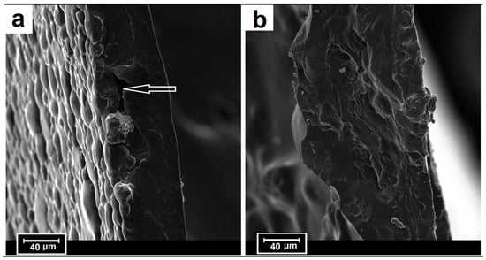 Observations of fracture morphology showed no differences between the samples after tensile tests at different speeds. Representative fracture structures of TPS/P and TPS/PH are shown in Figure 9. TPS/P fractures had a smooth surface (Figure 9a). Some discontinuities in the internal structure of the TPS/P film (shown by the white arrow) are present, which may be the reason for the lower tensile strength. TPS/PH samples have a dense morphology of the fractures with no visible cavities, but with a visible rough surface with brittle fracture characteristics (Figure 9b). Additionally, the appearance of microcracks was noted in the fractures of the TPS/P film under the surface of the bumps caused by the starch granules. Together with the microcracks on the surface (Figure 2b), they indicate the brittle adhesion structure of the gelatin phase around starch granules [37].