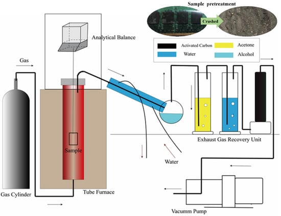 Supercritical fluid extraction [23,24,25] and pyrolysis [13,26,27,28] are promising methods for the harmless treatment of E-waste. Pyrolysis refers to the thermochemical decomposition of carbonaceous organic material in the absence or lack of oxygen through indirect heating to produce valuable fuels, such as pyrolysis gas, pyrolysis oil, and carbon black [28]. Wang and Zhang investigated the degradation process of brominated flame retardant (BFR) and BFR-containing waste computer housing plastic in various supercritical fluids (water, methanol, isopropanol, and acetone). Li and Xu used supercritical water (SCW) to decompose BER and recover metals from Waste Memory Modules (WMMs). Niu et al. used SCW to decompose the organics and recover Ta from Waste tantalum capacitors (WTCs). However, the technology of supercritical fluid extraction has strict requirements on the material of the equipment. More importantly, it is very expensive. Pyrolysis is a promising thermal technique, which can recover and remove organic material for resource recovery effectively and environmentally friendly. Diao et al. performed a series of molecular dynamics simulations (MDSs) to study the thermal decomposition characteristics of epoxy resin. Chen et al. researched vacuum pyrolysis characteristics and kinetic analysis of liquid crystal from scrap liquid crystal display panels. Liu et al. applied vacuum pyrolysis to degrade the organic material of waste ICs. Pyrolysis is considered a better treatment option than other options. Pyrolysis has the advantages of low environmental costs and high efficiency [13].