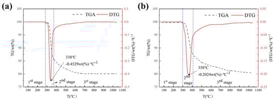 TGA and DTG curves of ICs under (a) nitrogen and (b) air atmospheres. The three pyrolysis stages are marked by blue lines.
