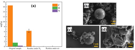 (a) Elemental analysis of samples before and after pyrolysis; (b) micro morphology of samples before pyrolysis; micro morphology of samples after pyrolysis under (c) an N2 atmosphere and (d) an air atmosphere, respectively.