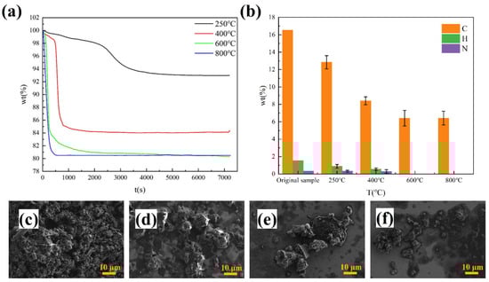 (a) Changes of mass with time at different temperatures; (b) elemental analysis of pyrolysis residue at different temperatures; micro morphology of samples (c) before pyrolysis and after pyrolysis at (d) 250 °C, (e) 400 °C, and (f) 800 °C.