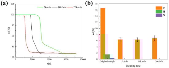(a) Changes of mass with time at different heating rates; (b) elemental analysis of pyrolysis residue at different heating rates.