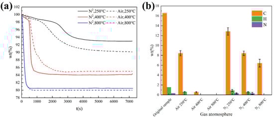(a) Changes of mass with time at different gas atmospheres and temperatures; (b) elemental analysis of pyrolysis residue at different gas atmospheres and temperatures.