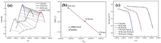 (a) The relationship between and obtained from Friedman method; (b) the relationship between and obtained from Kissinger method; (c) the relationship between and obtained from CR method.