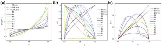 (a) g(α), (b) y(α), and (c) z(α) curves of pyrolysis of ICs and different standard kinetics models.