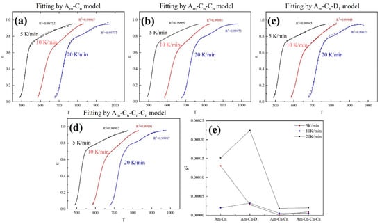 Fitting results by (a) two-step parallel model Am-Cn, (b) three-step parallel model Am-Cn-Cn, (c) three-step parallel model Am-Cn-D1, and (d) four-step parallel model Am-Cn-Cn-Cn; (e) comparison of fitting variances of different parallel models.