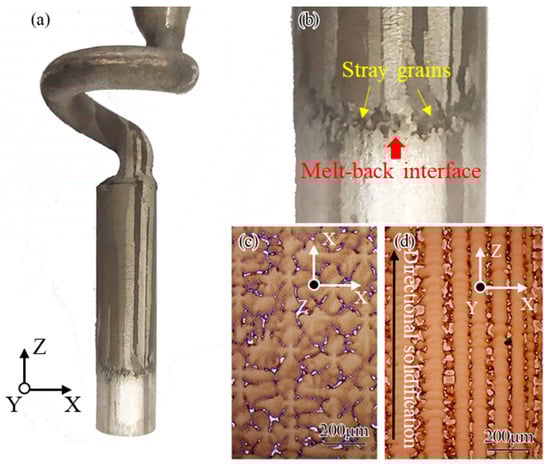 The macrostructure of the adjusted grain selection process assisted by directional columnar grains is shown in Figure 3a. It can be seen that well-oriented columnar grains were formed in the starter block, as the growth direction of the grains was basically parallel to the directional solidification. The columnar grains in the starter block were divided into two parts by the melt-back interface, namely the un-melted zone, which was located in the lower part, and the re-solidified zone in the upper part. Figure 3b shows a partial magnified view near the melt-back interface. A number of stray grains can be found to form exclusively at the surface of the directional columnar grains. The nucleation of stray grains was a transient phenomenon; it occurred only near the melt-back interface. Since the orientation of stray grains was random, which is attributed to nucleation behavior, only a few stray grains with an orientation advantage can grow up in the competitive growth process with the columnar grains. This phenomenon was consistent with the formation and growth of stray grains at the melt-back region of seeding for preparing single crystal casting. Subsequently, the number of grains in the starter block did not change significantly, whereas the number of grains decreased rapidly in the spiral part. A single crystal can be rapidly selected as the solidification front climbing to the spiral part; its cross-sectional and longitudinal microstructures are shown in Figure 3c,d, respectively. The <001> direction of the grain prepared by this method was closed to the direction of solidification, as shown in Figure 3d. It indicated that the grain selection method assisted by directional columnar grains could effectively prepare a single crystal with a small misorientation.