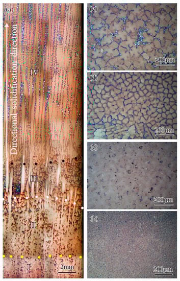 In order to further clarify the mechanism for obtaining a single crystal casting with a small misorientation using this adjusting grain selection method, the microstructure in the starter block was characterized, and the results are shown in Figure 5. From Figure 5a, it could be found that the starter block could be divided into four parts after directional solidification, namely the heat-affected zone, the mushy zone, the transition zone, and the directional growth zone. The heat-affected zone marked as I in Figure 5a was located at the lowest region of the starter block. From Figure 5b, it could be found that there was no obvious re-melting phenomenon in this zone, whereas the (γ + γ’) eutectic was almost completely eliminated, indicating that the microsegregation was significantly reduced. Mushy zone II was immediately adjacent to the heat-affected zone and there was no clear boundary between the two zones. Due to microsegregation, the (γ + γ’) eutectic reformed in the interdendritic region after directional solidification, as shown in Figure 5c. Transition zone III was clearly separated from the mushy zone by the melt-back interface, as shown in Figure 5a. Figure 5d shows atypical dendrites formed and some stray grains nucleated at the initial directional solidification stage. Finally, the directional growth zone IV could be found at the top part of the starter block, and a typical columnar microstructure was reformed, as shown in Figure 5a,e. It should be noted that Figure 5a displayed that the grain with a larger misorientation was overgrown by one with a small misorientation.