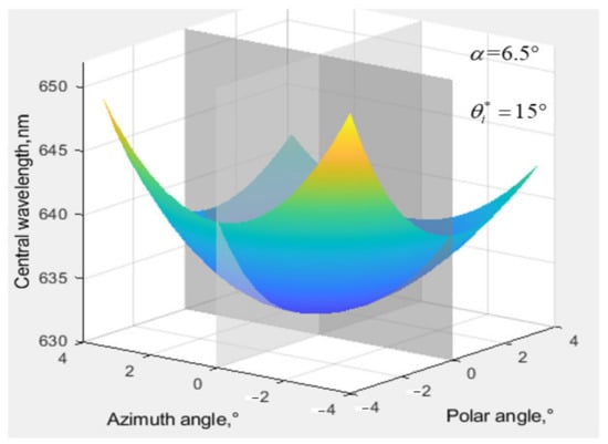 As shown in Figure 3, the central wavelength drifts with the increase in the incident light angle. In the azimuth plane, the drift of the central wavelength is symmetrically distributed. In the polar angle plane, the drift of the central wavelength is asymmetric, and the drift of the central wavelength near the AOTF crystal axis is greater than that away from the crystal axis when the incident light is inclined by the same angle from the vertical incidence to both sides.