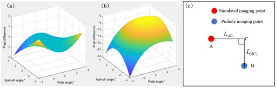 The difference between the imaging position of diffracted light at different incident angles of AOTF and pinhole imaging: (a) the difference in azimuth direction and (b) in polar direction, and (c) the image plane.