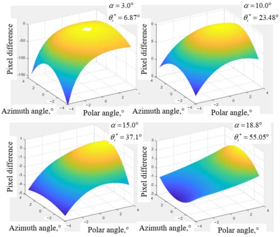 The in Figure 4c corresponds to the ordinate in Figure 4b, and the in Figure 4c corresponds to the ordinate in Figure 4a. AOTF aberrations are different in polar direction and azimuth direction significantly. In the azimuth direction, the aberration is 180° rotational symmetry, and the aberration is less than two pixels within a ±4° incidence angle. In the polar direction, the aberration follows the symmetrical distribution of the azimuth plane, and the aberration caused by oblique incidence is considerable. The larger the tilt angle is, the greater the aberration is, up to 30 pixels within ±4° incidence angle. It can be discovered from the comparison between Figure 3 and Figure 4 that the greater the center wavelength drifts, the more serious the AOTF aberration is.