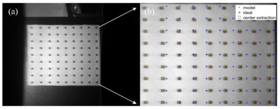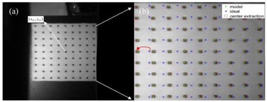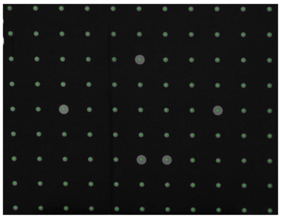 In Figure 8, the diameter of the large dots is 15 mm, the smaller is 8 mm, and the distance between the calibration points is 40 mm. The coordinates of the calibration point were obtained by the method of geometric center extraction, and the unsatisfactory calibration points were eliminated. Finally, the radial distortion coefficient of the imaging lens group could be obtained by Zhang Zhengyou’s calibration method, and the result is shown below as Equation (3).
