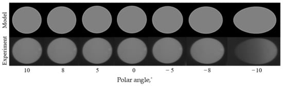 Simulated (upper row) and experimental (lower row) images with the AOTF tuned to = 632.8 nm ( = 72.84 MHz) for different angles of incident light in the polar plane.