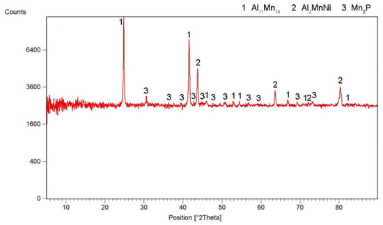 According to X-ray diffraction analysis (Figure 1), the metal sample in reduced state contains three phases, which are Al11Mn14, Al2MnNi and Mn2P. The Al11Mn14 phase (tetragonal, P4/mmm space group, a = 3.940 × 10−10 m, c = 3.580 × 10−10 m) appears to be very bright in the structure of Figure 2 and is most abundant in the sample [26]. Its chemical composition will be discussed below. The phase having the structure corresponding to Al2MnNi phase (cubic, Pm-3 m space group, a = 2.929 × 10−10 m) is dark in the optical micrograph and reaches smaller dimensions than the previous phases. In the diffraction pattern in Figure 1, the intensities of the diffraction lines belonging to this phase are lower than the ones of the Al11Mn14 phase, which corresponds to Figure 2 with a lower representation of this phase. The third phase in the XRD pattern, Mn2P (hexagonal, P-63 m space group, a = 6.08 × 10−10 m, c = 3.46 × 10−10 m) has the lowest intensity of the peaks in Figure 1. However, it is not visible in Figure 2 due to the given magnification. Further in the text, for the SEM microstructure with higher magnification, this phase is visible.