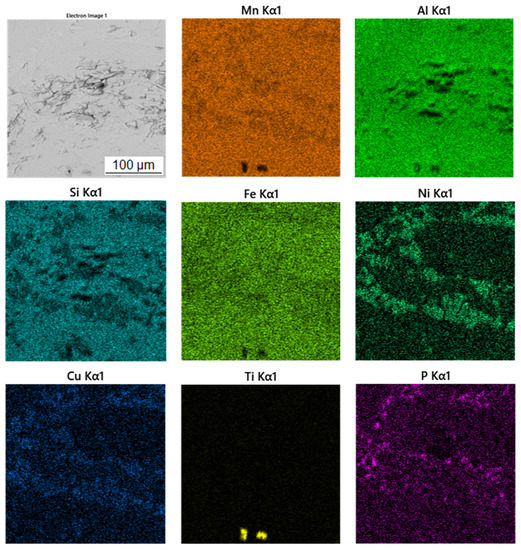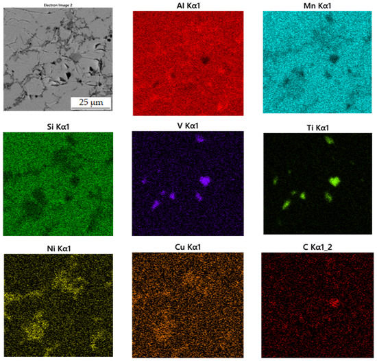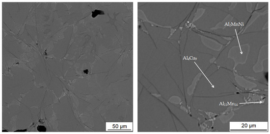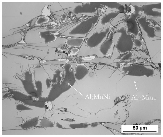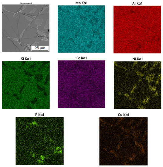 The second phase, light grey in Figure 10, contains 42.7 at.% aluminum, 31.3 at.% manganese, 7.4 at.% silicon and 6.4 at.% nickel. Due to higher content of nickel in this phase, it was identified as the Al2MnNi phase based on the results of EDS analysis and X-ray diffraction analysis. It is clear from the distribution of elements that both nickel and copper bind to this phase. The iron is relatively evenly distributed between the two phases present.