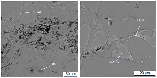 The last phase recognized by EDS analysis has a high content of titanium (35.7 at.%), carbon (49.6 at.%) and low contents of manganese (3.7 at.%) and aluminum (5.8 at.%). This phase was not identified by X-ray diffraction analysis, but from the EDS point analysis (Table 3) and elemental map (Figure 4) it can be determined that it is titanium carbide based on the high proportion of carbon and titanium. Cracking is visible around this phase in Figure 3. This is probably due to the different thermal expansion of the carbide and the surrounding phases, as a result of which cracks formed during the cooling of the alloy after reduction.