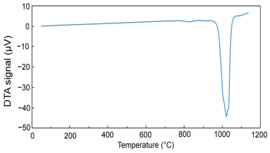 Figure 5 shows the DTA heating curve to determine the phase transformations during heating. At a temperature of 960 °C, an endothermic effect starts and reaches its minimum at a temperature of 1020 °C, then the DTA signal values return to a stable level. This endothermic peak is associated with the formation of a melt, which is most likely associated with a eutectic transformation. Based on these results, maximal sintering temperature was determined to be approx. 950 °C.