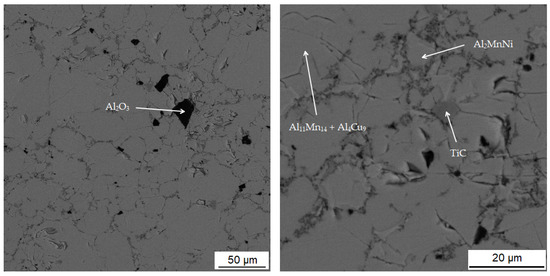 The microstructure of the alloys of all three sintered samples is shown in Figure 6. Grinding and subsequent sintering reduce the grain size (Figure 6a–c) because the particles of intermetallics are fragmented during the grinding process. Figure 6b and the XRD pattern in Figure 7 show the dominant phase (Al11Mn14), the darker phase (Al2MnNi) and the formation of new very small particles in the matrix phase. According to XRD, this phase has the structure of Al4Cu9 (cubic, P-43 m space group, a = 8.704 × 10−10 m), even though its chemical composition is probably strongly different, because the content of copper in the alloy is rather low. The alloy sintered at 950 °C (Figure 6b) has lower porosity than the one sintered at 900 °C (Figure 6a), because the partial melting occurred during sintering. Even though the temperature was set according to DTA to be below the observed eutectic temperature, the material was molten during the process, the possible reasons for which are as follows:
