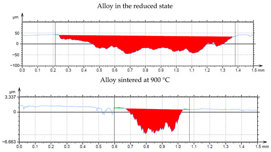 Wear track profile of alloy in the reduced state and the alloy sintered at 900 °C.