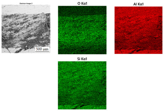 The last phase in this sample appears to be the darkest one in Figure 8 acquired in backscattered electron (BSE) mode and contains the highest amount of oxygen (42.0 at.%), followed by high amount of aluminum (35.5 at.%). From these values, it is determined that it is the Al2O3 phase. This phase was probably incorporated into the sample as a slag residue.