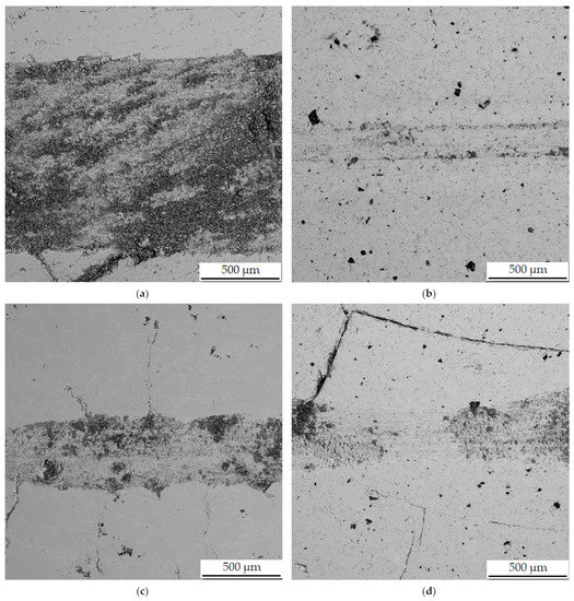 Wear tracks on aluminothermically prepared samples after testing with Al2O3 ball as the static partner. (a) Alloy with 100% excess of aluminum over stoichiometry in the reduced state; (b) alloy sintered at 900 °C; (c) alloy sintered at 950 °C; (d) alloy sintered at 900 °C and heat-treated by annealing at 800 °C for 3 h.