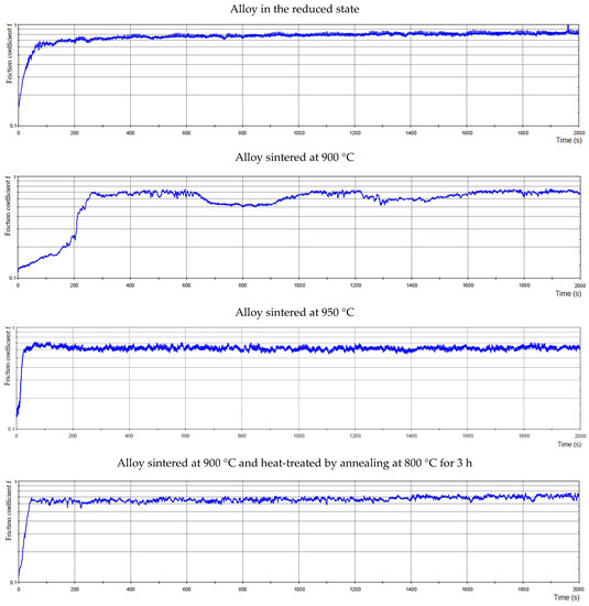 The coefficient of friction depending on the time for all alloys is in Figure 16. However, the friction coefficients were identical for the alloy sintered at 900 °C and 950 °C, reaching the value of 0.62. For the alloy sintered at 950 °C, Figure 16 shows a smoother course than for the alloy sintered at 900 °C. The roughness of the alloy sintered at 900 °C was 0.078 µm, and for the alloy sintered at 950 °C the roughness was 0.017 µm. The sample sintered at 900 °C and then heat-treated by annealing at 800 °C showed a higher value of the average friction coefficient than sintered samples, namely 0.66. The roughness for this alloy was 0.151 µm. The values of the average friction coefficient of the sample are different depending on the type of sample preparation. This could be due to the fact that a higher hardness value was measured in alloy sintered at 900 °C and then heat-treated by annealing at 800 °C; thus, the matrix in this sample is harder and more brittle than in the other samples. As these more brittle particles are more easily broken out, there was a slight increase in the friction coefficient in this sample.