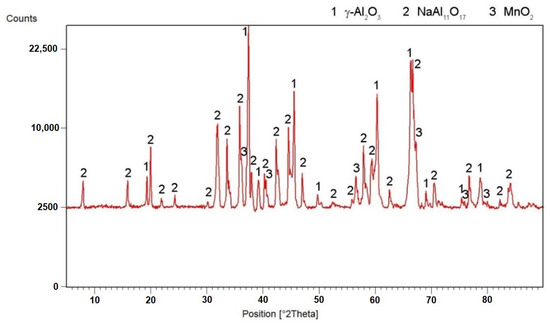 Table 2 shows the chemical composition of sample in the reduced state with 100% excess aluminum over stoichiometry measured by X-ray fluorescence (XRF). From the results of XRF analysis, it is evident that the metal part contains the most manganese, which is later confirmed by the result of X-ray diffraction analysis of this sample, where manganese is present in all three phases. Another element of the metal phase of the measured XRF is aluminum. It occurs mainly in the Al11Mn14 phase, but is also contained in the phase with the structure corresponding to Al2MnNi. Furthermore, it is clear from the table that the sample prepared aluminothermically also contains, in addition to manganese and aluminum, a large amount of iron, silicon, nickel and copper.