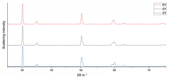 In general, identical phase compositions were found between the manufacturers for the processing steps and the different yttria contents. Therefore, only changes which were detected for both manufactures are presented in detail in the sections. The phase composition of all measurements after Rietveld refinement are deposited in the Appendix A (Table A1, Table A2, Table A3, Table A4, Table A5 and Table A6).